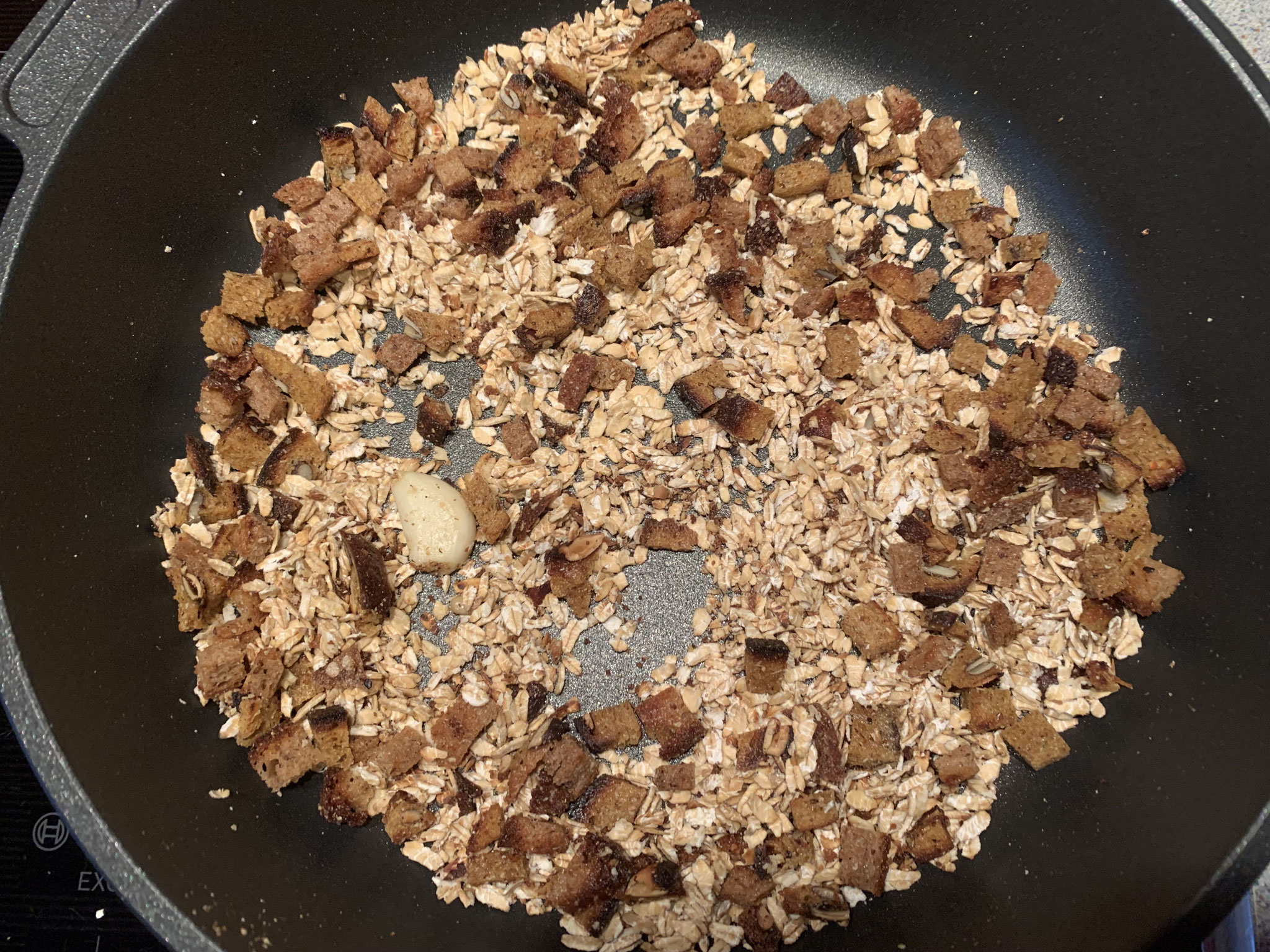 In einer Pfanne anrösten und ablöschen, kurz auf köcheln lassen. Knobi wieder heraus nehmen. Das Brühstück sollte kalt sein, wenn es in den Teig kommt.