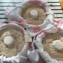 Nun habe ich in ein Gärkörbchen ein umgedrehtes kleines Trinkglas gestellt, ein Geschirrtuch hinein gelegt und es bemehlt.