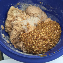 anrösten und mit ca. 120 ml Wasser zum ablöschen (Menge soll ausreichend sein zum Quellen, wird mit in den Teig gegeben)