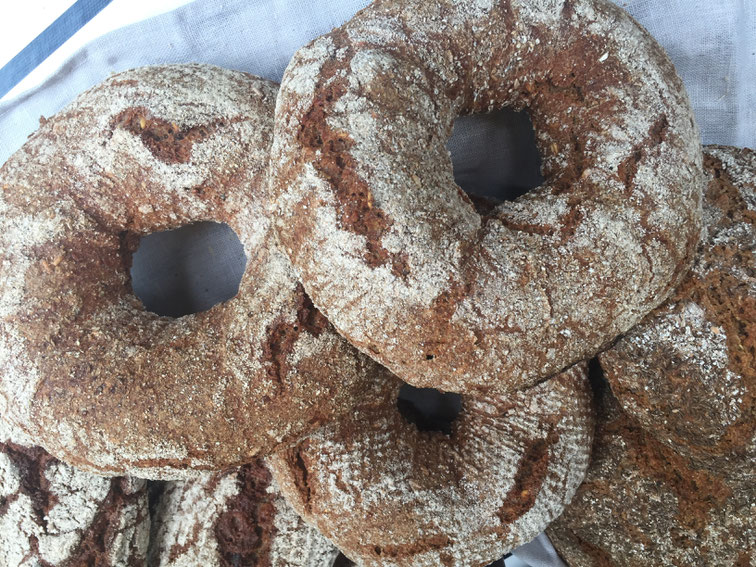 Mit den Fingern in der Mitte des Teiglings ein Loch stechen und leicht auseinander ziehen. Nun den Teigling noch etwas bemehlen und mit dem Schluss nach oben in das vorbereitete Gärkörbchen legen.
