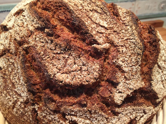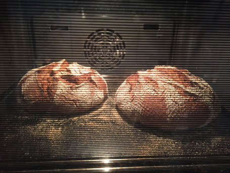 Dann wird das Brot in den gut vorgeheizten Ofen unter Schwaden eingeschossen und bei fallender Hitze (230 Grad) für 50-60 min gebacken.