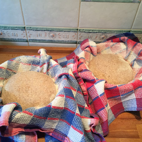 Nun ruhen die rund gewirkten Laibe noch ca. 1- 1 1/2 h im bemehlten, zu gedeckten Gärkörbchen.