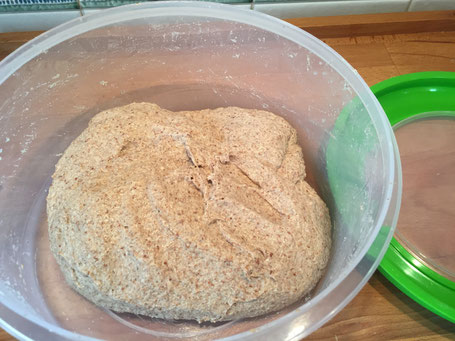 Wenn das Getreide frisch gemahlen wird, bitte kaltes Wasser benutzen, damit die Teigtemperatur nicht höher als auf 24 Grad ansteigt.
