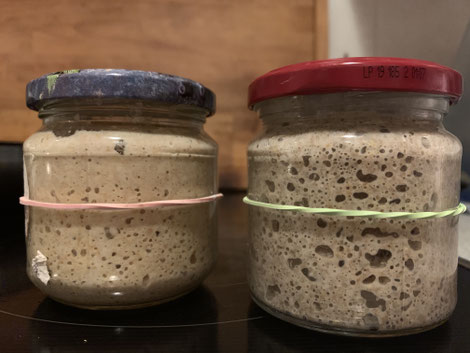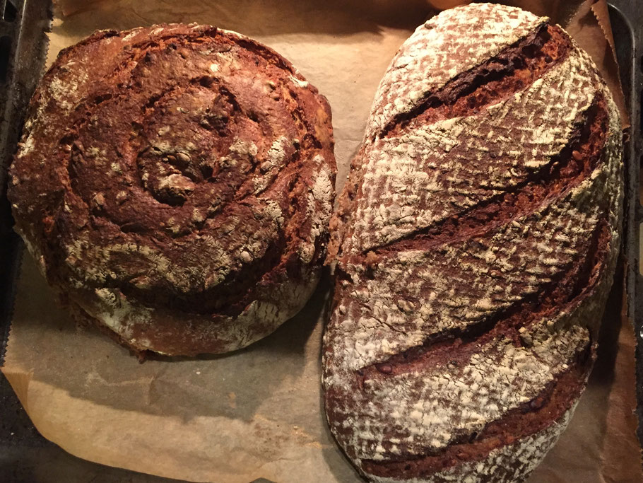 Nach der Stockgare den Teig akklimatisieren lassen und zu zwei Laiben formen und für 1h zur Stückgare stellen.