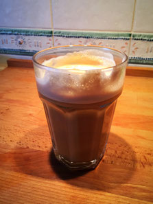 9. Der Kaffee schmeckt mit dieser Mandelmilch sehr gut. Sie sollte aber nicht zu heiß aufgeschäumt werde, da sie sonst gerinnt.
