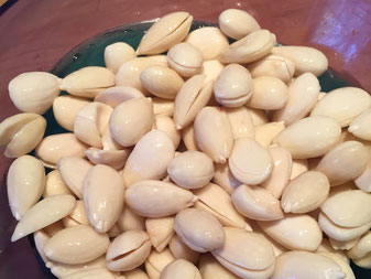 1. Die Mandeln sind nach acht Stunden im Wasser etwas aufgequollen.