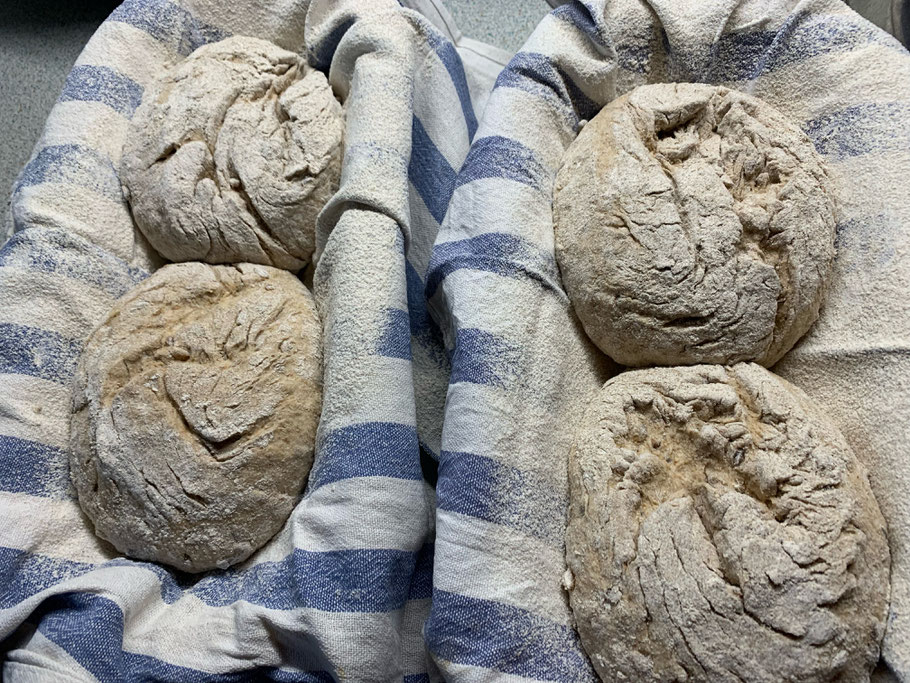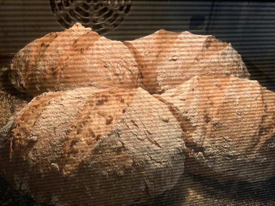 Im Gärkörbchen ruht der Teigling dann ca. 30-45 min bevor er bei 250 °C unter Schwaden eingeschossen wird.