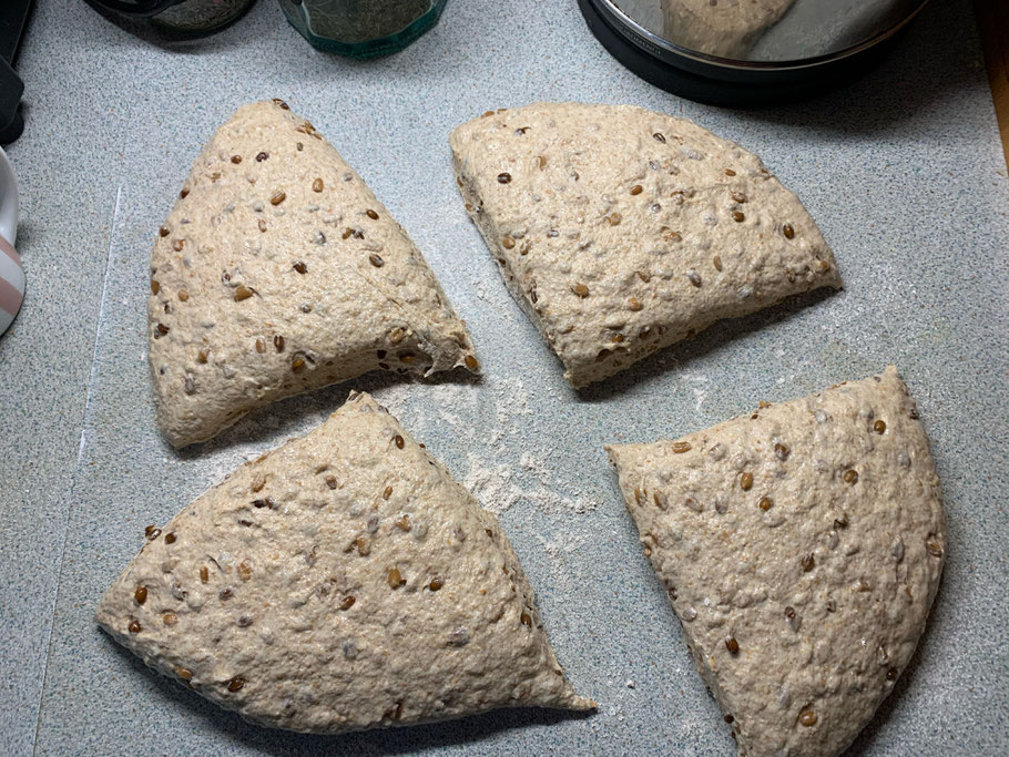 Nach der kalten Gare wird der Teig bemehlt, auf eine bemehlte Unterlage gestürzt, dort geteilt und in Form gebracht.