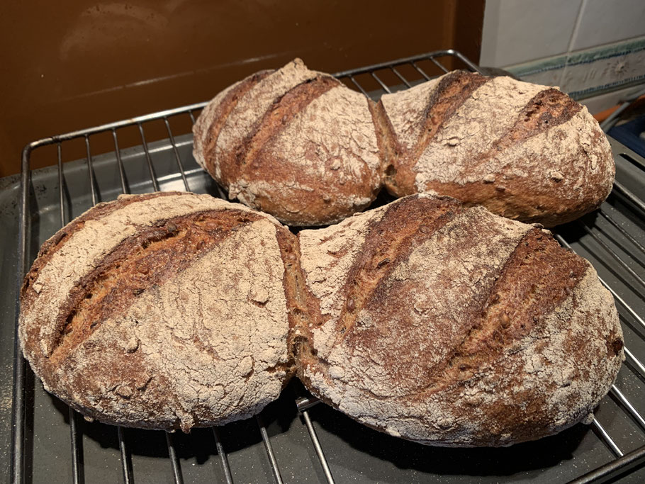 Nach 20 min wird der Dampf abgelassen und die Temperatur auf 220-230 °C reduziert. Nach insgesamt 60 min ist das Brot ausgebacken.