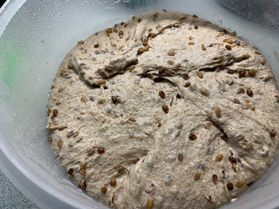 Eine Ruhezeit von ca. 10 min zwischen den verschiedene Zutaten sind beim Verarbeiten von Vollkorn hilfreich.